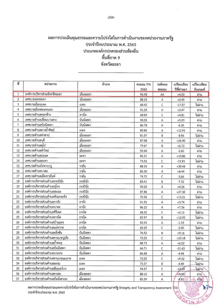 ผลคะแนนการประเมินคุณธรรมและความโปร่งใสการดำเนินงานของหน่วยงานภาครัฐ (ITA) ประจำปีงบประมาณ พ.ศ. 2565