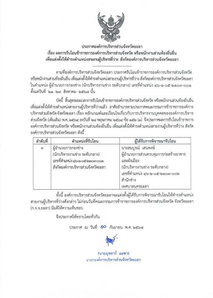ประกาศผลผู้ได้รับการพิจารณารับโอนเพื่อแต่งตั้งให้ดำรงตำแหน่งสายงานผู้บริหารที่ว่าง สังกัด อบจ.ยะลา