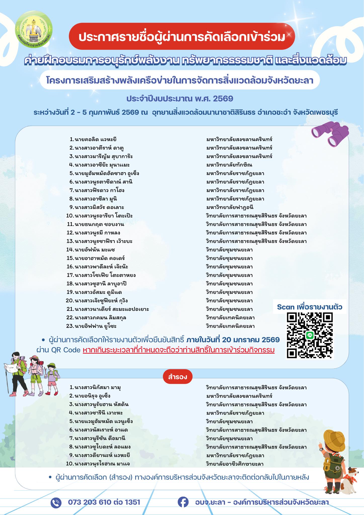 ประกาศรายชื่อผู้ผ่านการคัดเลือกเข้าร่วมค่ายฝึกอบรมการอนุรักษ์พลังงาน ทรัพยากรธรรมชาติ และสิ่งแวดล้อม อบจ.ยะลา ระหว่างวันที่ 2 – 5 กุมภาพันธ์ 2569 ณ อุทยานสิ่งแวดล้อมนานาชาติสิรินธร อำเภอชะอำ จังหวัดเพชรบุรี