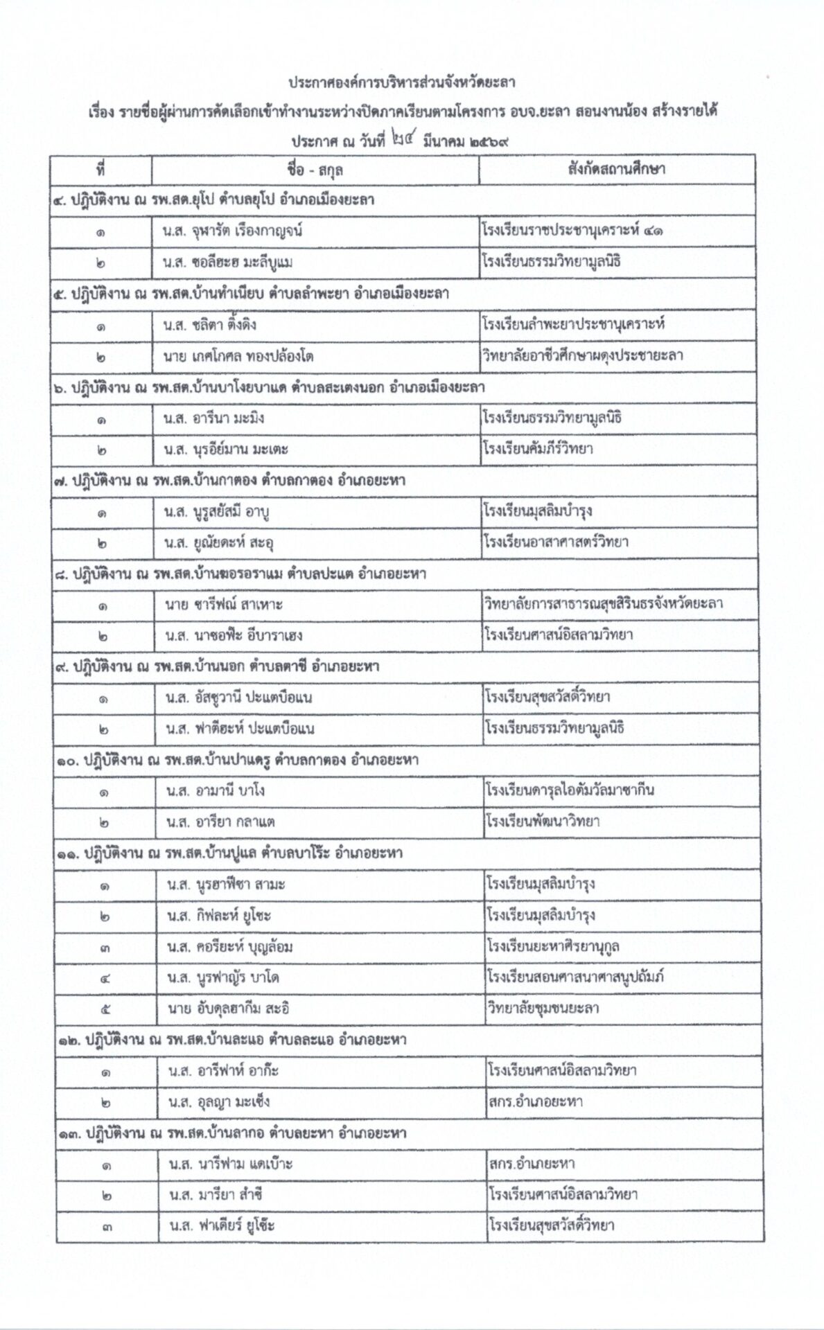 • ประกาศองค์การบริหารส่วนจังหวัดยะลาเรื่อง รายชื่อผู้ผ่านการคัดเลือกเข้าทำงานระหว่างปิดภาคเรียนตามโครงการ อบจ.ยะลา สอนงานน้อง สร้างรายได้ ลงวันที่ 24 มีนาคม 2569
