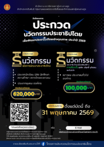กิจกรรมข่าวประชาสัมพันธ์ ประชาสัมพันธ์โครงการประกวดนวัตกรรมประชาธิปไตยเพื่อพัฒนาประชาธิประไตย เชิงคุณภาพประจำปี 2569 โดยมีวัตถุประสงค์เพื่อสนับสนุน ค้นหา นำเสนอนวัตกรรมเพื่อพัฒนาประชาธิปไตยที่มีความสร้างสรรค์ สะท้อนชีวิตในสังคมไทย อันจะนำสู่การจัดการแก้ไขปัญหาได้อย่างต่อเนื่อง เพื่อให้ประชาชนที่สนใจได้รับทราบ สามารถดูรายละเอียดด้านล่างนี้ อัพเดทล่าสุด 20-ก.พ.-2026 43 แชร์ ประกาศ การประกวดนวัตกรรมเพื่อการพัฒนาประดาวน์โหลด เอกสารประกอบการพิจารณาพร้อมผลงาน (สมบูรณ์ดาวน์โหลด โครงการนวัตกรรม 69ดาวน์โหลด