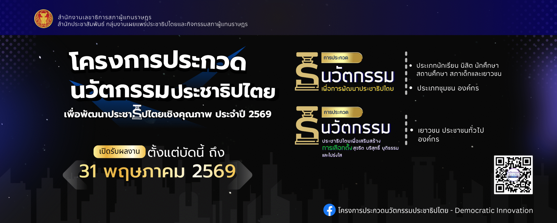 กลับไปที่ "ประชาสัมพันธ์โครงการประกวดนวัตกรรมประชาธิปไตยเพื่อพัฒนาประชาธิประไตย เชิงคุณภาพประจำปี 2569…" Cover เพจ Poster นวัตกรรม 69 (1) ต่อไป