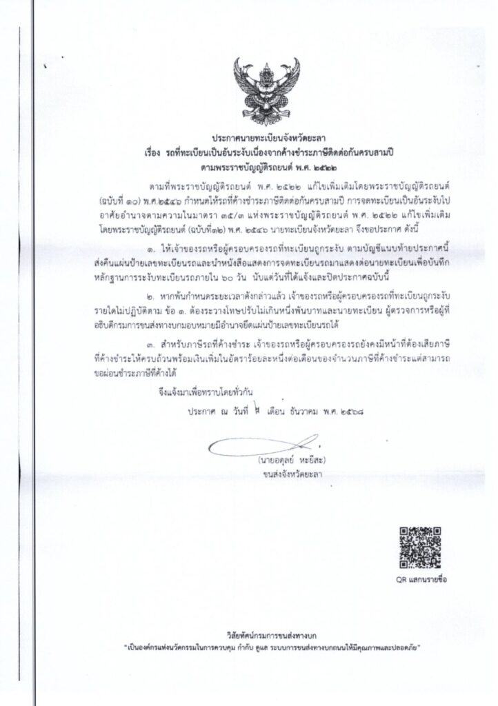 ข่าวประชาสัมพันธ์ ประชาสัมพันธ์ รถที่ทะเบียนเป็นอันระงับ เนื่องจากค้างชำระภาษีติดต่อกันครบสามปี ตามพระราชบัญญัติรถยนต์ พ.ศ. 2522 และบัญชีรถที่ทะเบียนเป็นอันระงับ ประจำเดือน พฤศจิกายน 2568 สามรถสแกน QR รายชื่อ ตามเอกสารด้างล่างนี้ อัพเดทล่าสุด 23-ธ.ค.-2025 3 แชร์