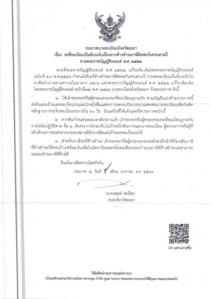 ข่าวประชาสัมพันธ์ ประชาสัมพันธ์ รถที่ทะเบียนเป็นอันระงับ เนื่องจากค้างชำระภาษีติดต่อกัน ครบสามปี ตามพระราชบัญญัติรถยนต์ พ.ศ. 2522 และบัญชีรถที่ทะเบียนเป็นอันระงับ ประจำเดือน ธันวาคม 2568 อัพเดทล่าสุด 16-มี.ค.-2026 9 แชร์