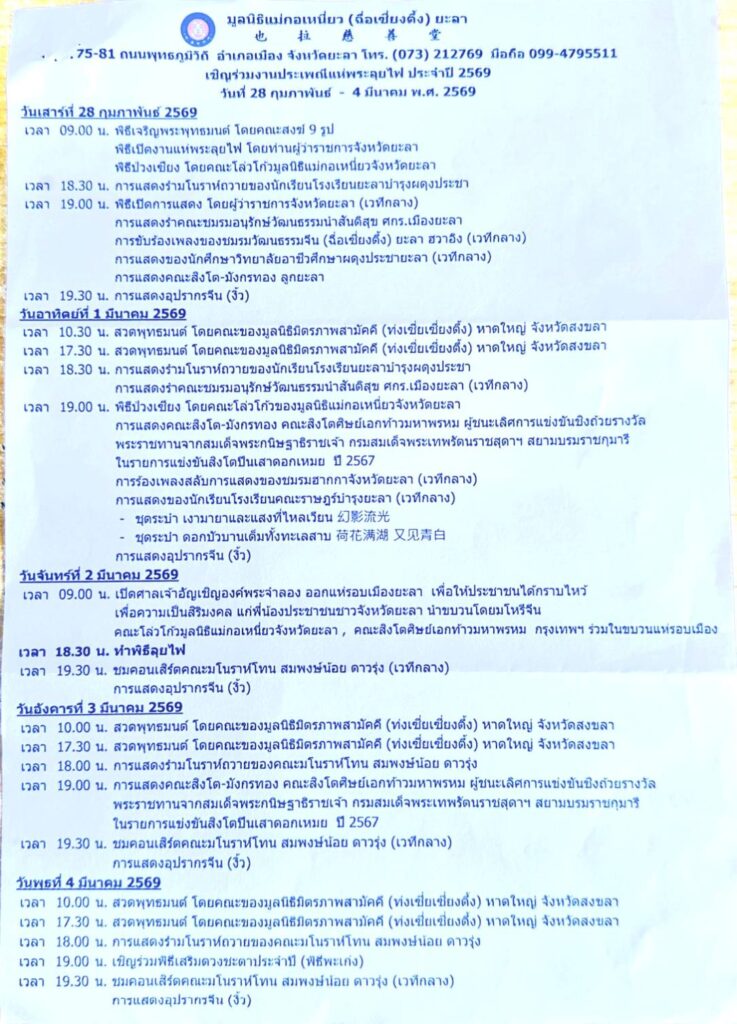 ข่าวประชาสัมพันธ์ ประชาสัมพันธ์ เชิญร่วมงานประเพณีแห่พระลุยไฟ ประจำปี 2569 ในวันที่ 28 กุมภาพันธ์ – 4 มีนาคม 2569 ณ มูลนิธิแม่กอเหนี่ยว (ฉื่อเซียงตึ้ง) ยะลา On 28-ม.ค.-2026 25 แชร์