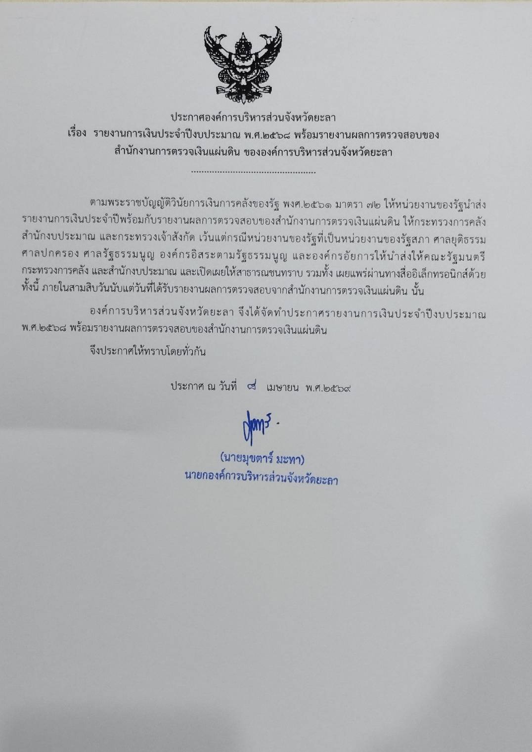 รายงานผลประจำปีพร้อมรายงานการตรวจสอบ(สตง.) รายงานการเงินประจำปีงบประมาณ พ.ศ. 2568 พร้อมรายงานผลการตรวจสอบของสำนักงานตรวจเงินแผ่นดิน อัพเดทล่าสุด 17-เม.ย.-2026 5 แชร์ รายงานผลการตรวจสอบงบการเงินประจำปี 2568ดาวน์โหลด ประกาศรายงานผลการตรวจสอบของสำนักงานตรวจเงินแผ่นดิน 2568ดาวน์โหลด