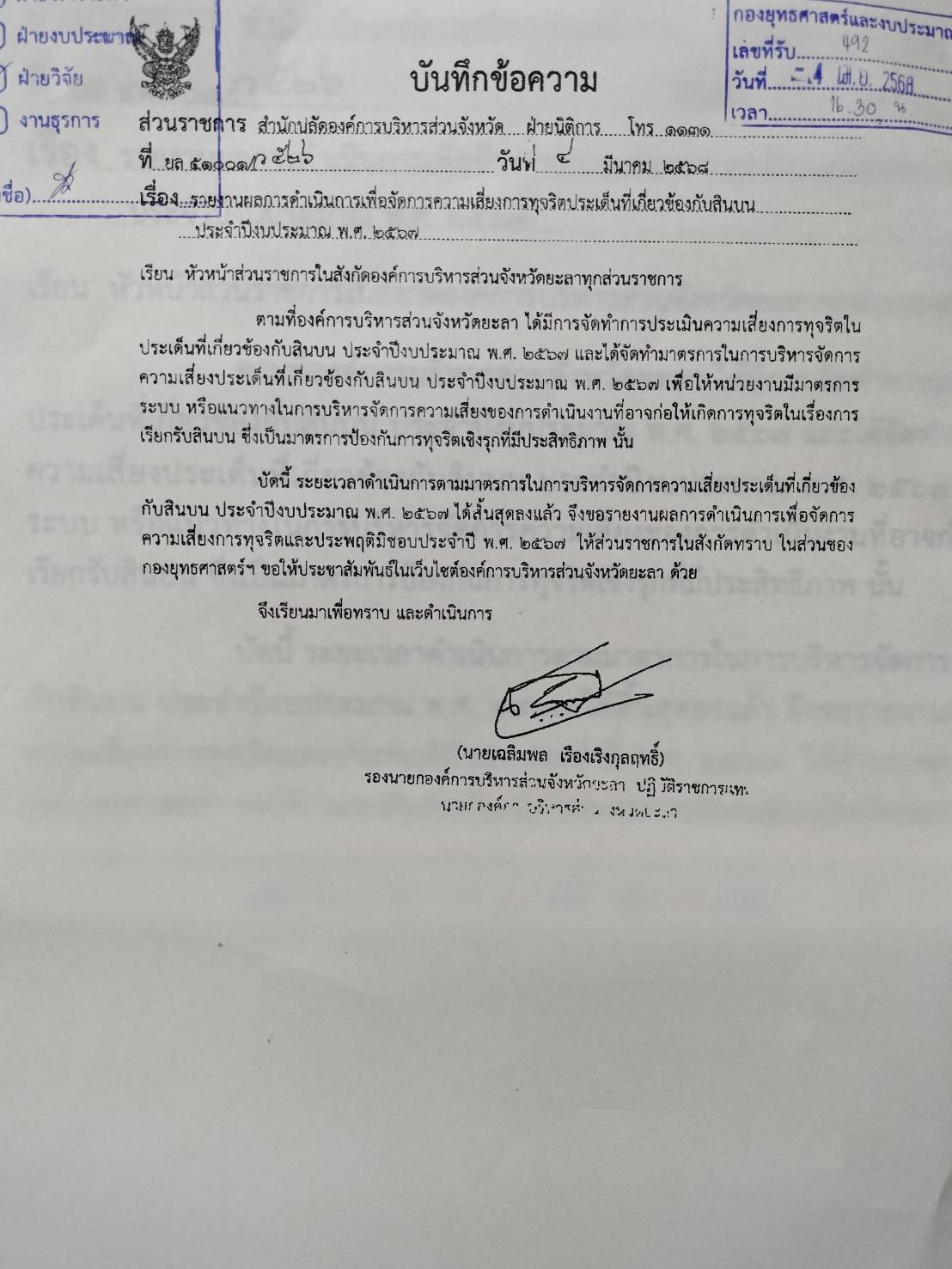 • รายงานผลการดำเนินการเพื่อจัดการความเสี่ยงการทุจริตประเด็นที่เกี่ยวข้องกับสินบน ประจำปีงบประมาณ พ.ศ. 2567