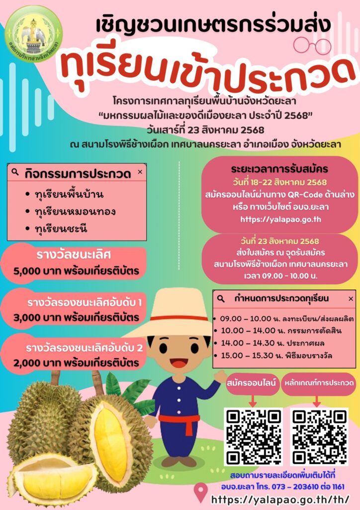 ข่าวประชาสัมพันธ์ เชิญชวนเกษตรกรร่วมส่งทุเรียนเข้าประกวด โครงการเทศกาลทุเรียนพื้นบ้านจังหวัดยะลา อัพเดทล่าสุด 18-ส.ค.-2025 99 แชร์ “มหกรรมผลไม้และของดีเมืองยะลา ประจำปี 2568“ ในวันเสาร์ที่ 23 สิงหาคม 2568 ณ สนามโรงพิธีช้างเผือก เทศบาลนครยะลา อำเภอเมือง จังหวัดยะลา