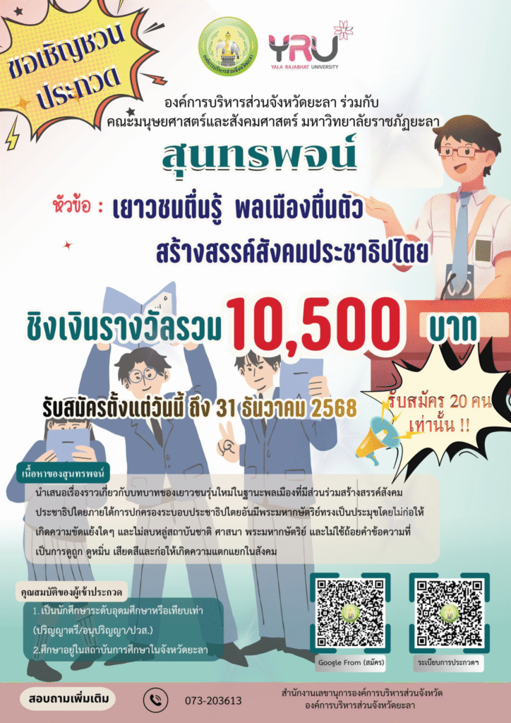 องค์การบริหารส่วนจังหวัดยะลา ร่วมกับ คณะมนุษยศาสตร์และสังคมศาสตร์ มหาวิทยาลัยราชภัฏยะลา ขอเชิญชวนนักศึกษาในจังหวัดยะลา เข้าร่วมการประกวด สุนทรพจน์ ภายใต้หัวข้อ “เยาวชนตื่นรู้ พลเมืองตื่นตัว สร้างสรรค์สังคมประชาธิปไตย” เพื่อส่งเสริมบทบาทของเยาวชนรุ่นใหม่ในการมีส่วนร่วมสร้างสรรค์สังคมประชาธิปไตยอย่างสร้างสรรค์และปราศจากความขัดแย้ง