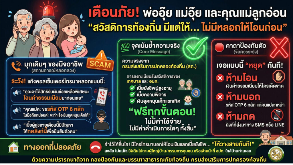 เตือนภัย! มิจฉาชีพหลอก “สวัสดิการท้องถิ่น” เจาะกลุ่มผู้สูงอายุ–แม่ลูกอ่อน ห้ามโอน–ห้ามบอกรหัส