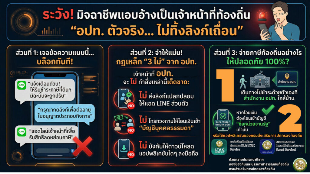 อินโฟกราฟิกเตือนประชาชนให้ระวังมิจฉาชีพแอบอ้างเป็นเจ้าหน้าที่องค์กรปกครองส่วนท้องถิ่น (อปท.) ส่งข้อความหรือทัก LINE หลอกให้ชำระภาษี ต่ออายุใบอนุญาต หรือให้กดลิงก์เสี่ยงสูญเงิน